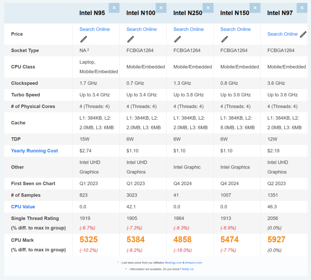 ■CPU Benchmarks Intel N95 vs N100 vs N250 vs N150 vs N97