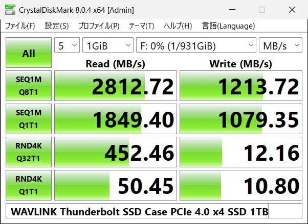 このSSDケースに、PCIe 3.0 x4 M.2 SSD 512GBを搭載して、DiskMarkを走らせました。