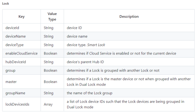{'deviceId': 'XXXXXXXXXXXX', 'deviceName': 'ロック', 'deviceType': 'Smart Lock', 'enableCloudService': False, 'hubDeviceId': '', 'master': True}