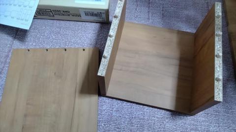 木工用ボンドが付属品で付いています ダボを差し込む前に付属のボンドを穴奥に少し付けてタボを差し込みます その後、別の板穴にボンドを少し塗って板を組み立てます