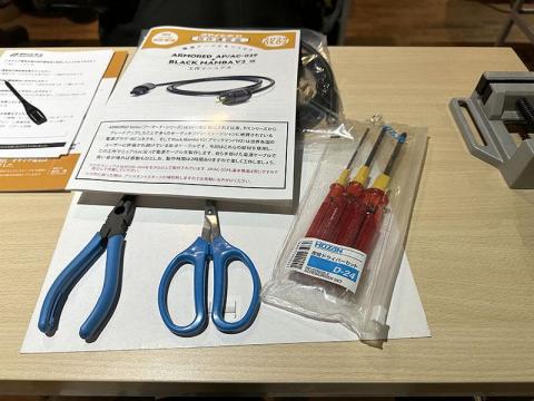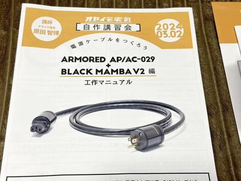 今回自作に挑戦するのはオーディオ用電源ケーブル「BLACK MAMBA V2」で、プラグや構造等は自作講習会向けに市販品と一部異なるというものです。参加費は1万円(税込)で、当日会場で現金払いという形です。ちなみにその際に発行される領収書は、当日オヤイデ電気の直販店に持参すると20%OFF割引券として使えるという特典がありました。