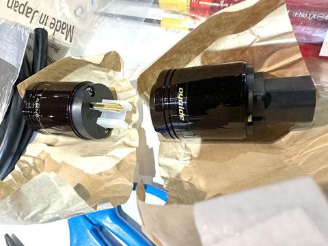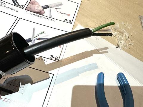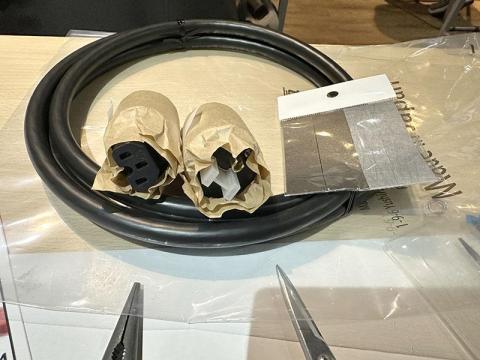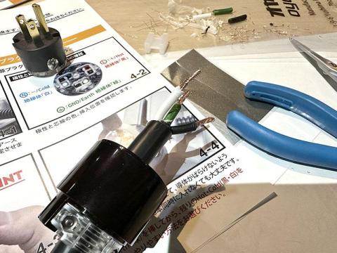 手順としては、まずケーブルの片側にACプラグのボディ部分を通し、ケーブルの皮膜を剥いてプラグを取り付け、終わったらインレットプラグ側も同様に処理、一通り済んだらスタッフの方に強度チェックをしてもらった上で仕上げを行い、導通チェックに異常が無ければ完成です。