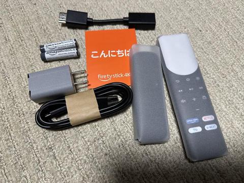 内容物一式です。FireTV Stick 4K 2nd gen本体の他、リモコン(本体より大きい)、ACアダプター+USBケーブル、HDMI延長ケーブル、リモコン用電池(単4×2本)、簡易ガイドが入っていました。