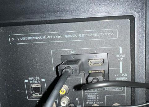 TVのHDMI端子に接続するわけですが、端子への負荷などを考えると添付のHDMI延長ケーブルは使った方が良いでしょう。ARC(Audio Return Channel)対応の端子に接続することを指定されていますので、ARC表記があるHDMI1入力に接続しています。