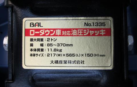 BAL大橋産業製のローダウン対応油圧ジャッキNO.1335です.最大荷重は2ton.