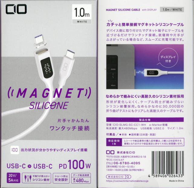 パッケージの表面には、商品写真が中央に移っていて、写真の上に、MAGNET / SILICONE 片手でかんたんワンタッチ接続という商品の特徴が上部には、メーカーロゴとケーブル長及びケーブル色が印字されています。