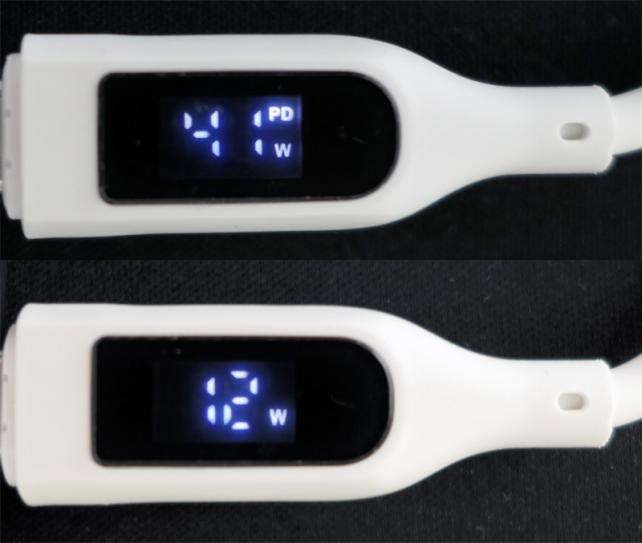 ケーブルの片方には、ディスプレイが付いていて、給電電力がワット表示(W)が数字で表示され、USB PD(Power Delivery)仕様で充電している際には、PDというインジケータも表示されます。