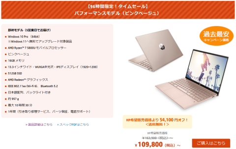なんと、Pavilion Aero 13-beのパフォーマンスモデルのピンク限定で10万9800円(税込み)。
