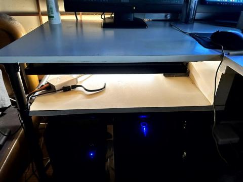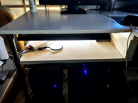 この一見無意味に見える棚は写真を撮るために物は退かしてますがいつもはすぐ使う物等を雑に置いておくためのスペースで照明があると割と重宝します。この棚(の下には薄い書類用の引き出し)のせいでmicroATXミニタワー筐体までしか置けないのです。('A`)