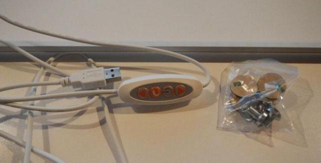 電源ON/OFF 明るさ&電球色 昼白色 昼光色 三段階調色と磁石の付いた取付台座と薄い金属製のシート、それを貼り付ける両面テープ。スイッチ付きのUSBケーブルは測ってないけどそこそこ長いです。