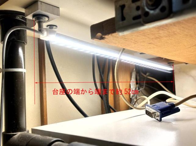大雑把でテキトー人間(「適当」では無い)なので採寸してから検討とか面倒な事してません。当てずっぽうで「だいたいこんなもんだろう」有る材料で現物合わせのやっつけ加減が自作のサブテーブルから伺える酷さですね。いや製品は悪くないです。ライト本体は台座の端から端までざっくり約52cmですライト本体の発光部分は約50cmです。