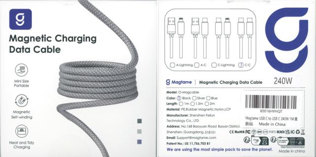 パッケージの表面は、白背景に中央部にケーブルの写真があり、上部にはメーカーロゴとMagnetic Charging Data Cableという文字が印字されていて、左側には、ピクトグラムと共に、Mini Size Portable,Magnetic Self-Windong、Neat and Tidoy Chargingの文字が印字されています。