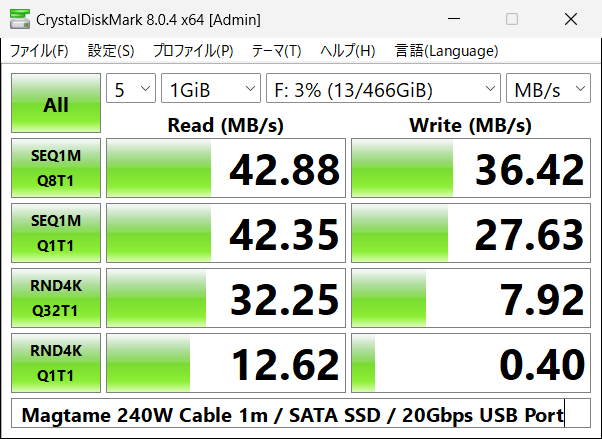 USB 2.0相当の480Mbps程度(USB 3.0の1/10程度)しか出ませんでした。