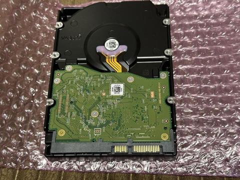 外観上は従来のWD80EAZZとの差は、ラベル記載の文字以外に見つけられません。昔のHDDであれば基板上にキャッシュメモリーのDRAMが実装されていたのですが、今は内側に実装されていて見えませんからね…。