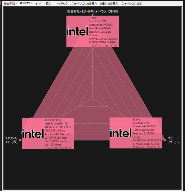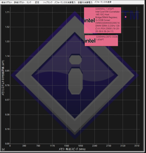 結果のID番号 : Intel Core10W (Cometlake-WS 10C) Host Bridge/DRAM Registers; 2x 32GB Corsair CMW32GX4M2E3200C16 DIMM DDR4 (3.2GHz 128-ビット) PC4-25600 (16-20-20-38 6-58-24-11)