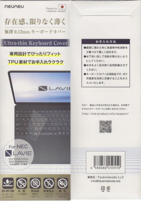 パッケージは、薄い厚紙で構成され、表面にはNEC PCのキーボードにキーボードカバーを一部付けた写真が中心に印刷されていて、上部にはメーカーロゴ、日の丸のマークと、Planned by a Japanese company、存在感、限りなく薄く、極薄 0.12mm キーボードカバー、Ultra-thin Keyboard Cover、専用設計でぴったりフィット、TPU素材でお手入れラクラクと、何度も同じような文言が並びます。