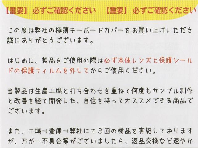 パッケージには、キーボードカバーが透明のプラ板に載って収納されていて、別途確認事項の紙が入っていました。