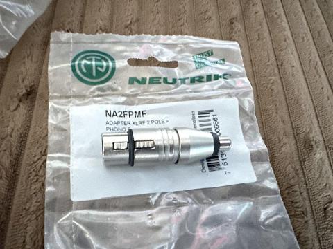 今回注文したのはNEUTRIK NA2FPMFという、XLR 3pin メス(2番HOT) ー RCAピンの形状変換を行うものです。左右2ch分変換が必要ですので、同一商品を2つ購入しています。