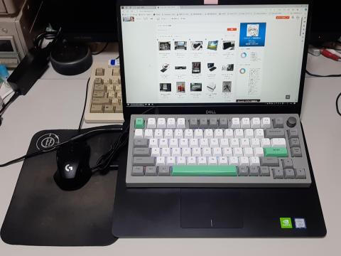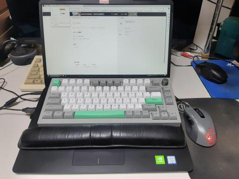 ノートパソコンの上に置いて、パームレストを置けば、キーボードを代替できたよ。スピーカー音量、キーボード内蔵LEDの点灯、Bluetooth接続先の変更などに対応したマルチファンクションキーを持っているので、ノートパソコンのキーボードのようになったのは便利だった。