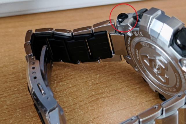 赤丸部分を押し込むことでバンドを外すことが出来る!!当たり前ですが、工具は一切要らないです。