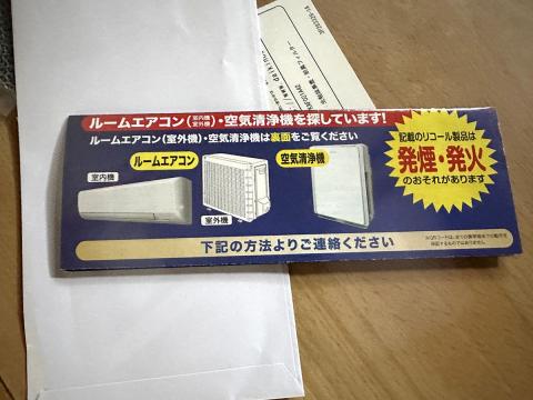 何故か封筒が同梱されていたのですが、これは過去のリコール対象製品の告知でした。中身には対象製品のリストが掲載されていて、保守部品に同梱しておけば対象製品のユーザーが見る可能性が高い