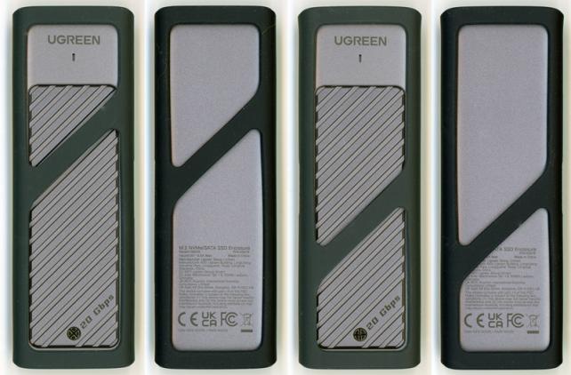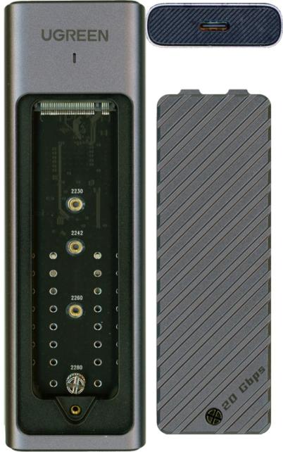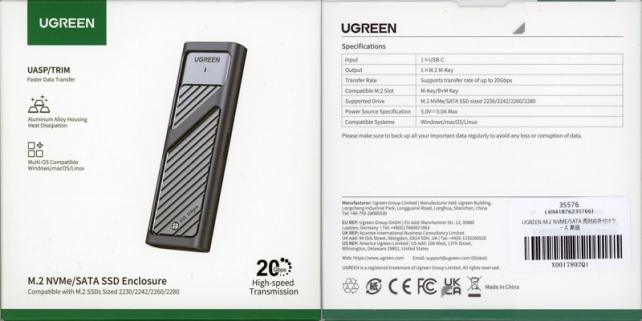 パッケージは、白色にグリーンのアクセントカラーが印象的なパッケージで、表面には、SSD本体を付属のシリコンケースに入れた状態の写真が印刷されていて、最上部にメーカーロゴ、UASP.TRIM対応で高速データ転送、アルミの金属ケースで放熱効果か高い、Windows macOS Linux のマルチOS対応と特徴が記述され、最下部には、M.2 NVMw/SATA SSDケースで、2230/2242/2260/2280サイズのM.2 SSDに対応していることが記述され、右下には、20Gbps対応と謳ってあります。