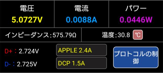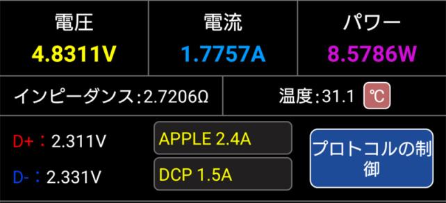 早速、充電を行ってみると、4.83V/1.78A=8.58Wで充電できることを確認できました。