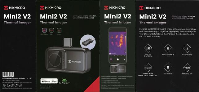アウターカートンの表面には、本体写真が大きく印刷されていて、上部にはメーカーロゴ、その下に型番とHIKMICROのサーマル機器でスマートフォンを賢くする的な文言が記載されています。
