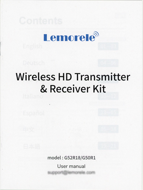 パッケージは、白ベースで、表面には、中央にHDMI送信機とHDMI受信機が並んで印刷されていて、上部にはメーカーロゴ、下部には、Wireless HD Transmitter and Receiverと記載されています。