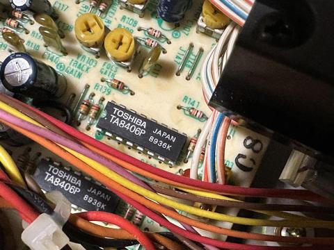 赤い楕円で囲っているICが問題のチップです。これは光学ドライブ制御用のOPAMP、東芝TA8406Pです。TA8406P自体は数カ所使われているのですが、故障の原因となるのはディスクドライブメカに最も近い位置に設置されているものです。酷く故障している場合にはこのチップの周辺の基板が焦げていることもあります。ある記事で読んだ話では、動作時このICが100℃を超える辺りまで発熱しているそうで、まあ焼損しても不思議は無い訳です。逆に言えば基板のパターンが損傷するレベルでなければ、TA8406Pを新品に交換することで動作の不具合が解消することもあるようです。故障品をお持ちの方は試してみる価値はあるでしょう。