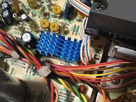 配線を少し動かして周囲を確認すると、干渉するような部品は写真では配線の下になってしまっていますがタンタルコンデンサーが1つある程度です。これに触れないようにヒートシンクを設置すれば良いでしょう。なお、TA8406Pは大体20mm×6mm程度とさほど大きくないチップですが、これにピッタリ合わせようとしてもなかなかそのようなヒートシンクは見つからないでしょう。ある程度大きいヒートシンクを使うことが大前提となります。