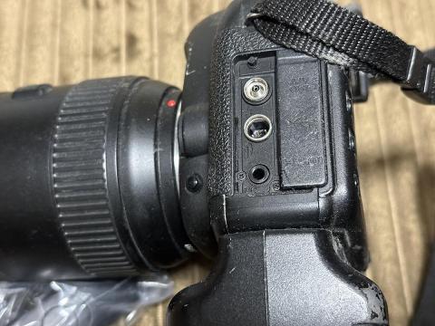 EOS 5D MarkIIの場合はカメラを構えた場合に左手側となる側面にアクセサリー端子類がまとめて並んでいますので、その中からレリーズ端子を探して装着します。
