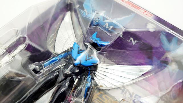鮮やかで爽やかなブルーと、メタリックシルバーの塗装が採用されており、光を受けて美しく輝きます。特に胸元の「ウィング」のエンブレムやスーツのラインの細かい部分まで丁寧に塗り分けられており、製品のクオリティは高いです。ブリスターパックの外側から適当なこと言ってて、すいません。