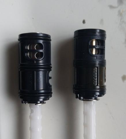 外した部品と新品のTH557を比べると、外したものはパッキン部分の張り出しが殆ど無くなっている。劣化していたのは間違いなさそう。なおってくれるかな?