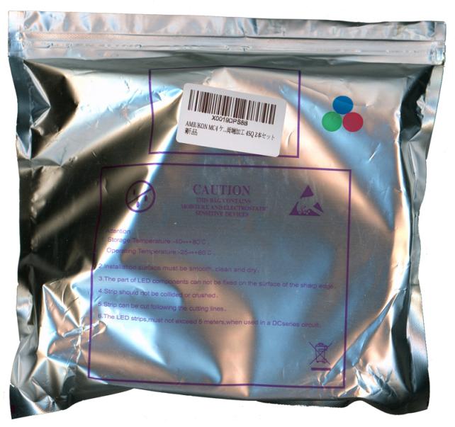 パッケージは、チャック付きの銀色のポリエチレン製の袋で、商品を特定するためのバーコードが印字されたラベルが貼ってあり、注意書きが紫色で印字されています。