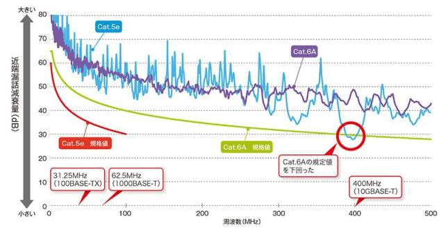 また日本製線がCAT5eに10GBpsを通した場合のノイズの減衰状況について、資料もあります。でも、250MHzくらいまでは6Aとほぼ同じような減衰ですが、そこを超えるとだんだんと落ちているのが分かります。