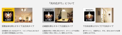 全方向タイプと言われる260度、広配光タイプと言われる180度、下方向タイプと言われる140度。