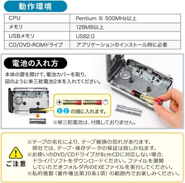 - 専用ソフトを使うことで簡単にカセットテープの音源をデジタル録音できます。(※カセットテープに録音することはできません)