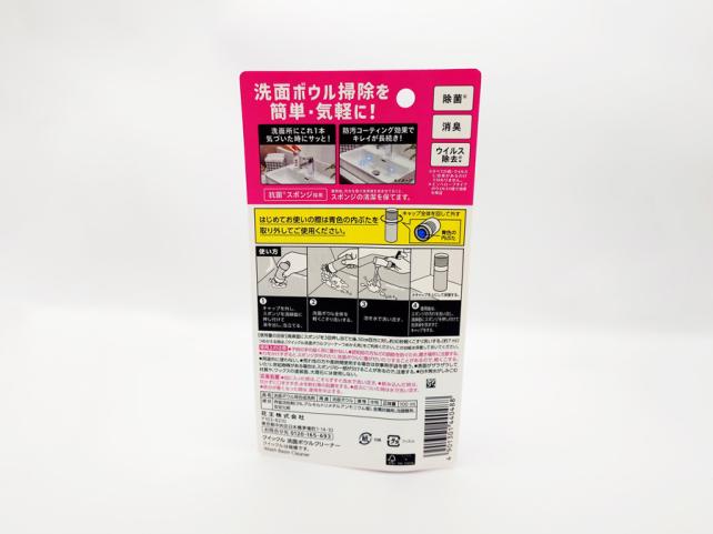 洗剤と容器が1セットになっており、蓋を開けて先端に付いているスポンジを洗面台に押し付けると洗剤が出てくるので、それで掃除をするという仕組みになっています。