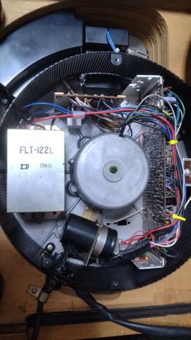 中央にモーター、左電源トランス、下が電解コンデンサー、右がサーボ基板、上に電源基板とリレーなど 上部の黒いカバーは押しボタン機構です ダイカストシャーシーに基板やら