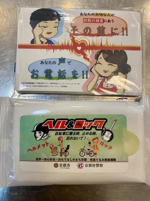 各種啓発活動をお知らせするために、警察官の方々がポケットティッシュとウエットティッシュを