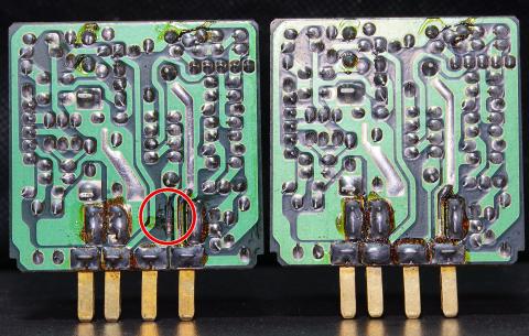 こんだけ。チョーシンプル。元の基盤でもこの2か所は直接つながっていて、そこから分岐した回路で警告灯を点灯させている構造だったので、警告灯がいらないならこれでOKなのだ。