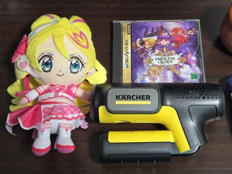 大きさ比較として近くにあったキュアフレンズぬいぐるみとセガサターンのソフトを並べてみました。