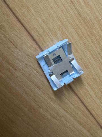 見ると内部の板バネ部分が金属疲労を起こしたらしく折れてしまっていました。ボックス側のスイッチは左右に動く形となっていて、この板バネが中のコマを動かすことによって押し込む動きを左右の動きに変換していますから、この板バネが折れてしまってはいくら押し込んでも動作しないのは道理です。