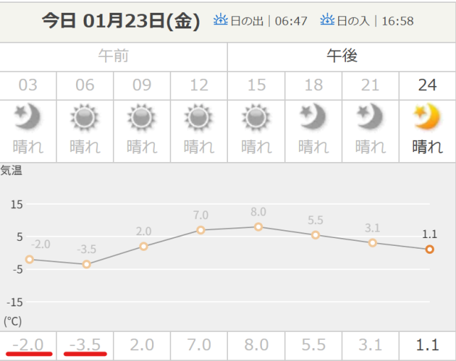 10年に1度レベルの低温という強力寒波ですが、当方の住んでいる地域では1/23が最も寒いという予報で最低気温は-3.5度でした。