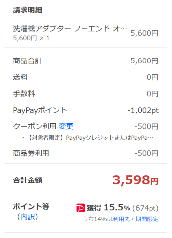 ポイント、クーポンで2002円引かれて、さらにポイント還元15.5%で674ポイントも戻ってきたという・・・実質2924円という。非常にお得なタイミングで購入できた。