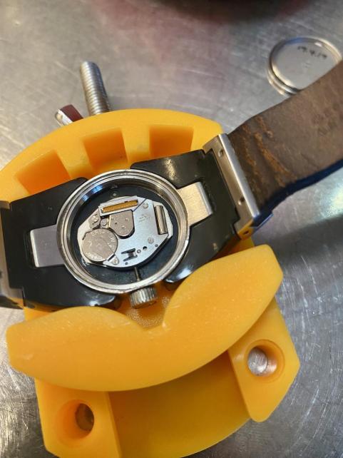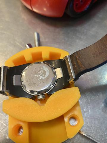 治具に時計を裏向けにセット スクリューバックを専用治具で反時計回りに回して解放