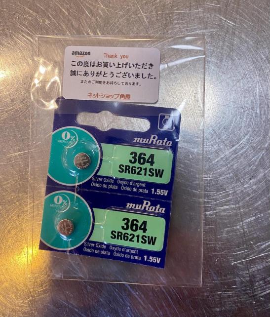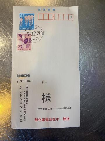 3日後届いた電池は封筒利用(料金85円) 酸化銀電池在中の赤文字あり
