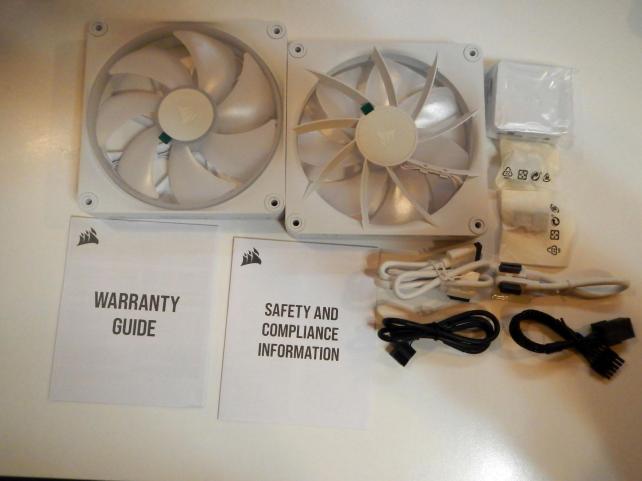 綺麗な白いファンです、内容物全てです。複数台のファンをデイジーチェーン接続出来るので最低限のケーブルで配線出来すっきりさせられます、特に隣り合い密着するファン同士は接続用のブロックで通電出来るのでケーブル要らずです。