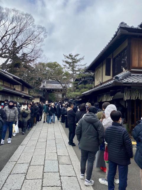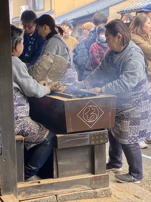 炭の香りときな粉がまぶされた餅が焼ける匂いを楽しみながら列に並ぶことになります。